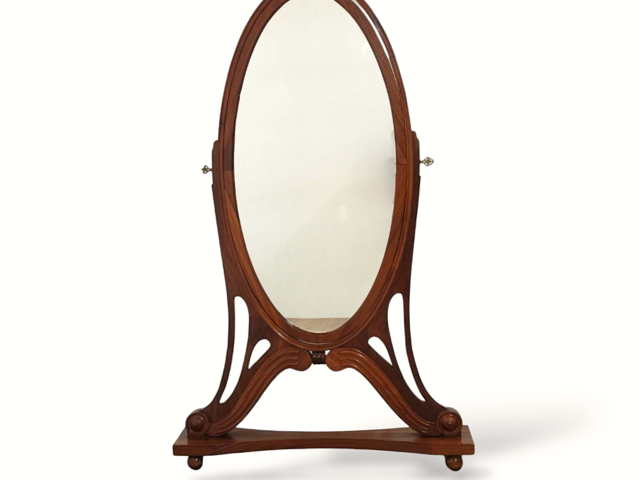 Specchiera basculante e autoportante in legno di mogano con specchio ovale. Il mobile è da...