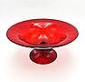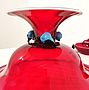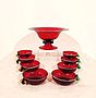 Importante servizio da dessert per 8 persone in vetro soffiato rosso, rifinito da un bordo bianco. Il servizio è formato da 8 ciotole e 1 coppa con piede, ogni elemento è decorato da piccole pere in vetro giallo, verde e celeste. La manifattura è Barovier, etichetta sul fondo. Quel marchio data il servizio al periodo 1919 - 34 (vd. foto). Murano, anni '20.